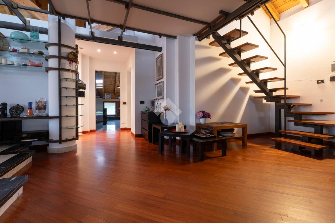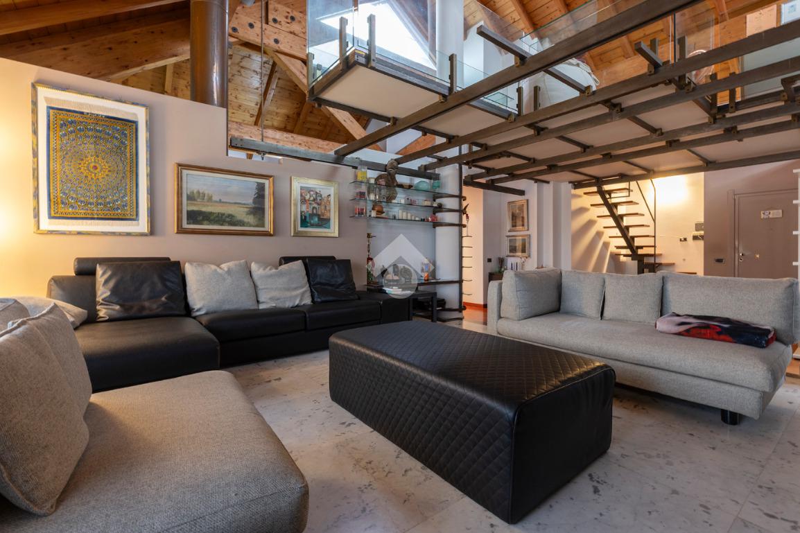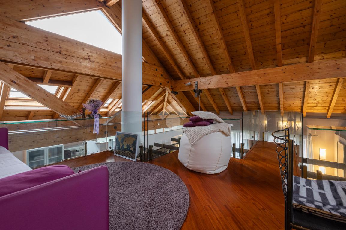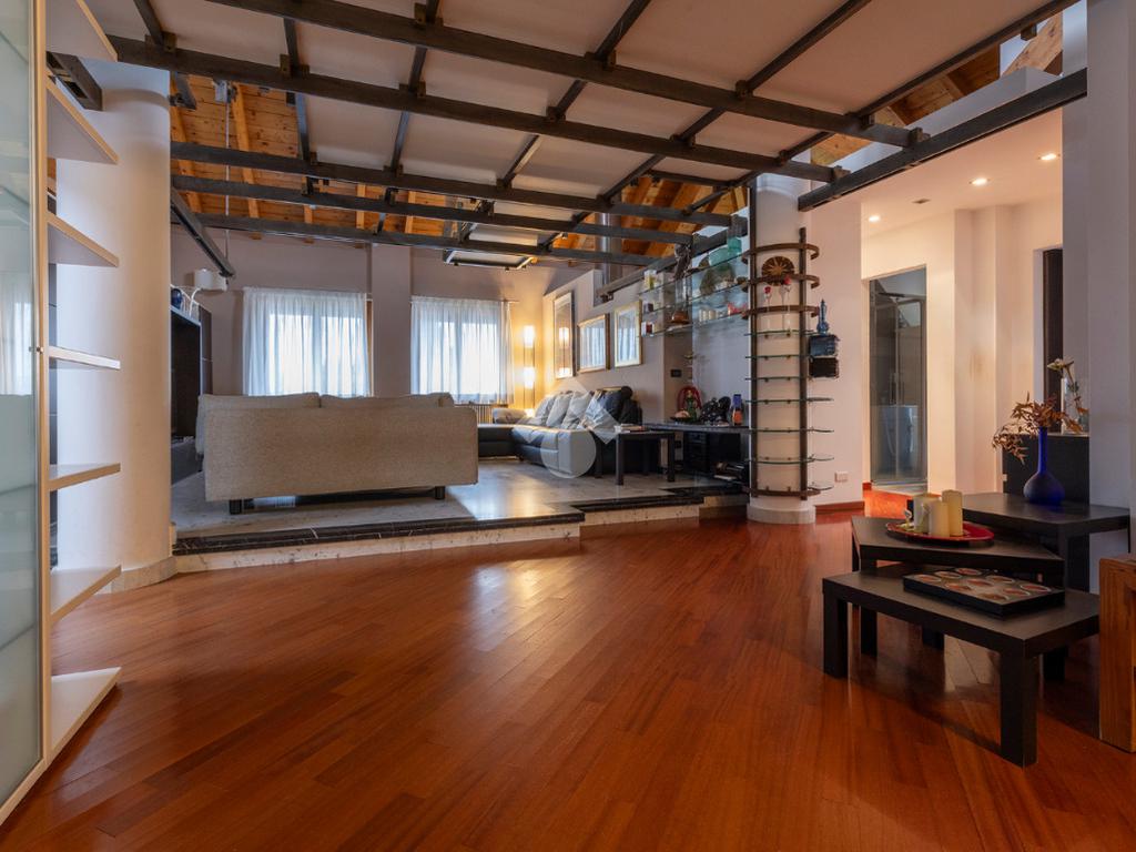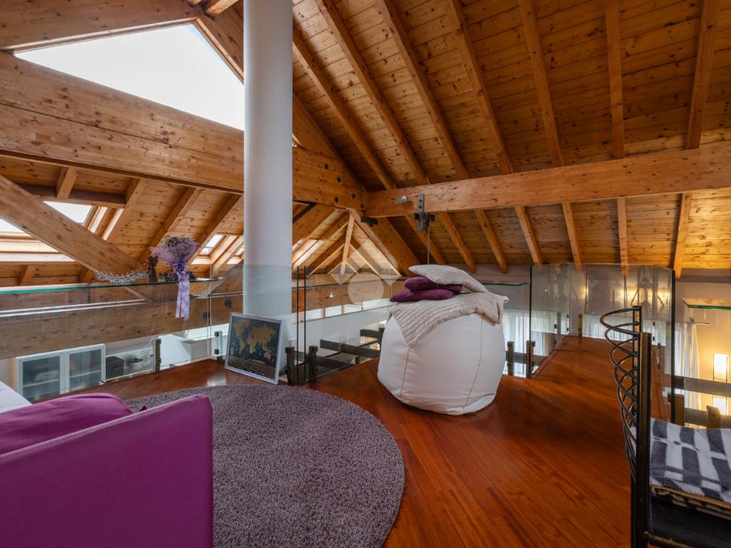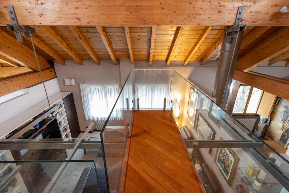 L’accesso conduce a un soggiorno ampio e scenografico, caratterizzato da altezze importanti e arricchito da un suggestivo soppalco a vista, che dona respiro e luminosità all’ambiente.