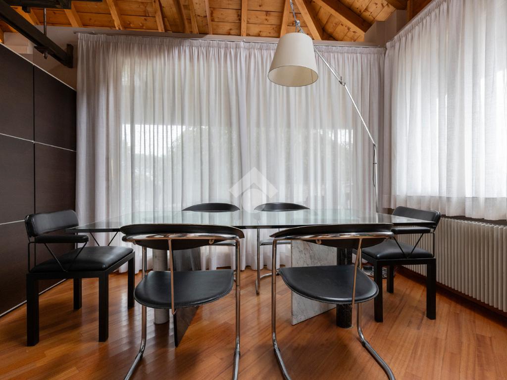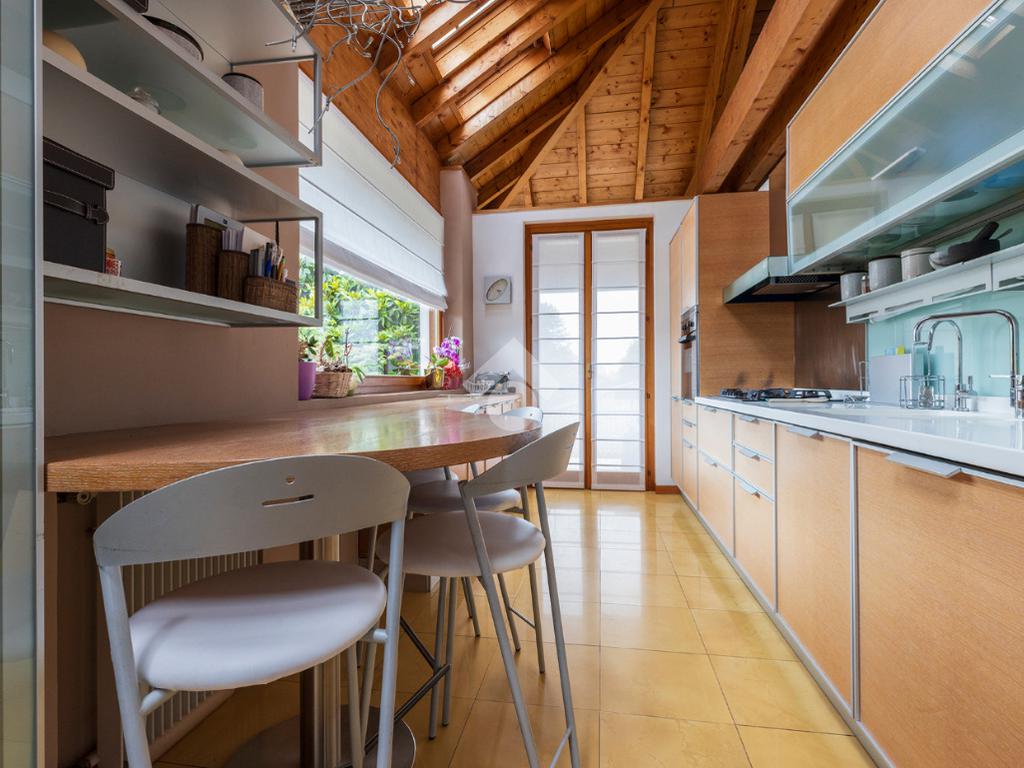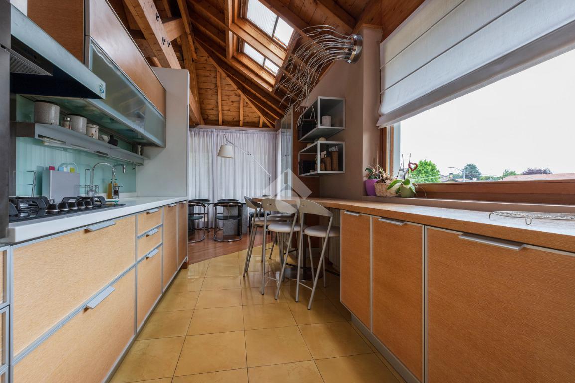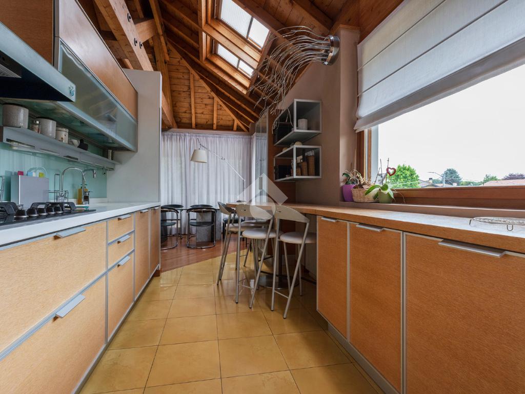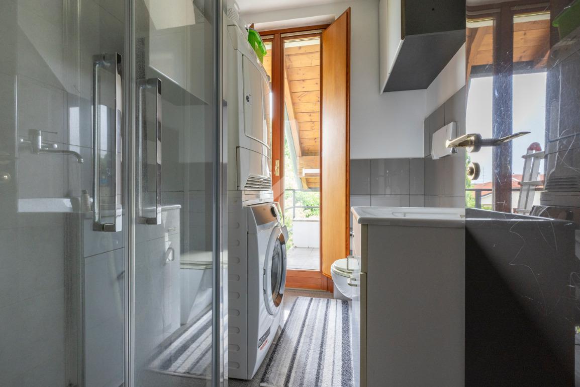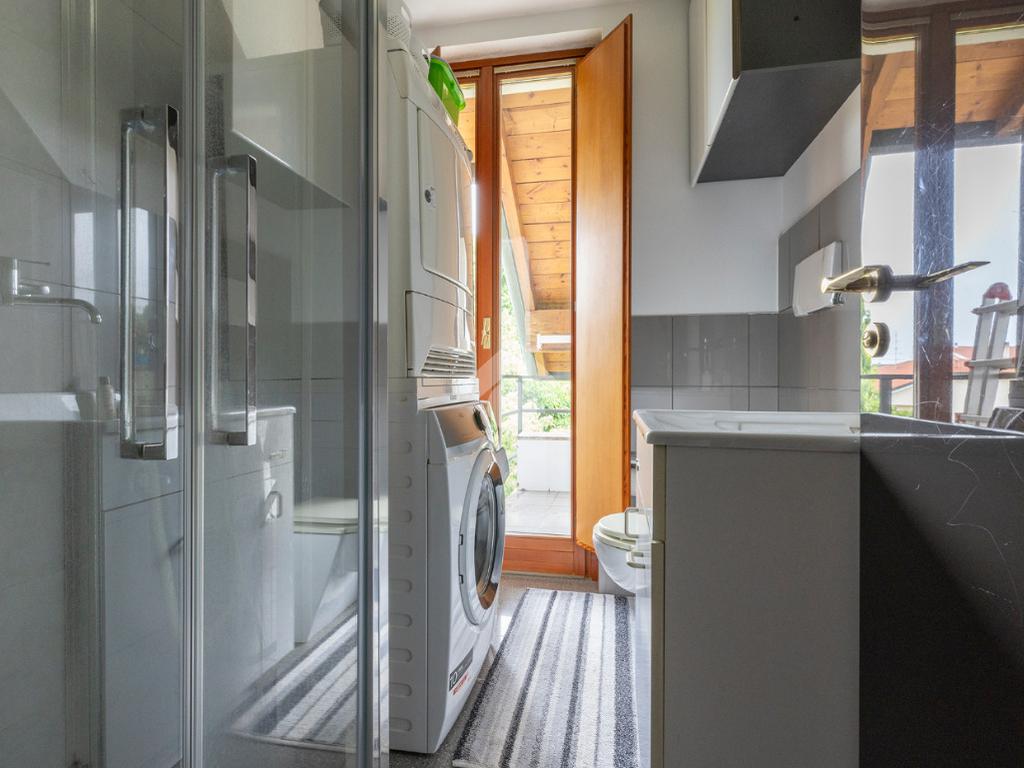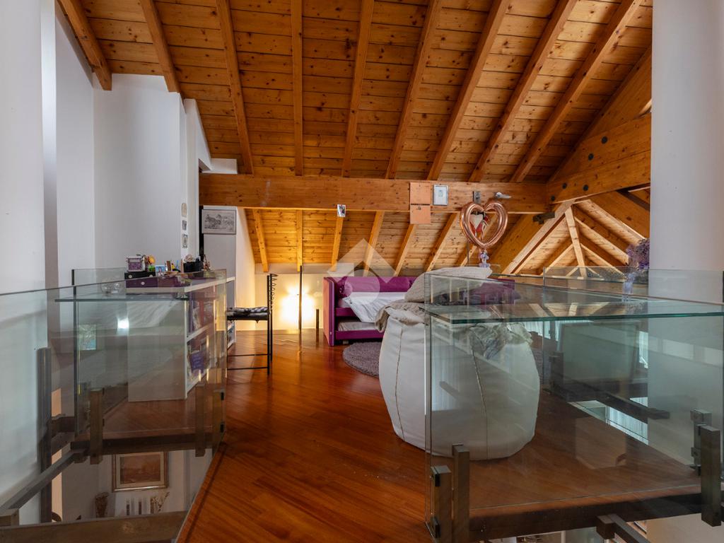 La zona giorno è ben distribuita: sulla sinistra troviamo la sala da pranzo e la cucina, resa ancora più luminosa grazie alle grandi finestre Velux mentre la zona notte è più riservata: sulla destra si sviluppano una camera matrimoniale con finestre Velux, una seconda camera e due bagni, di cui uno con comoda lavanderia e balcone.